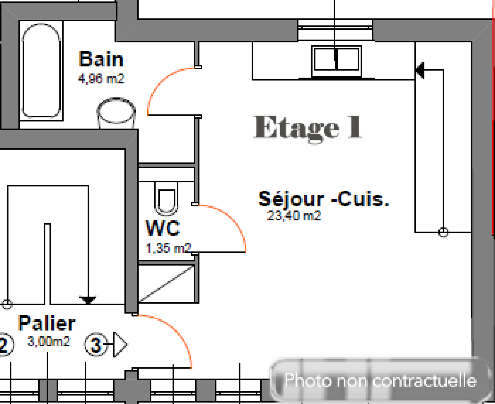 - Au 1er niveau : Un espace salon-séjour cuisine, une salle d'eau et un wc.