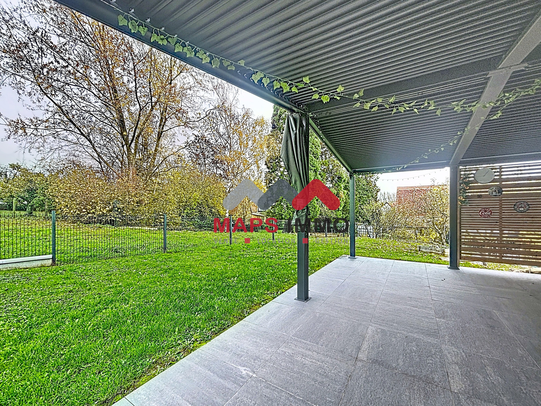 À l’extérieur : du potentiel sur l’avant avec de nombreux stationnements possibles, un vaste jardin à l’arrière avec vue dégagée, ainsi qu’une superbe terrasse avec pergola bioclimatique.