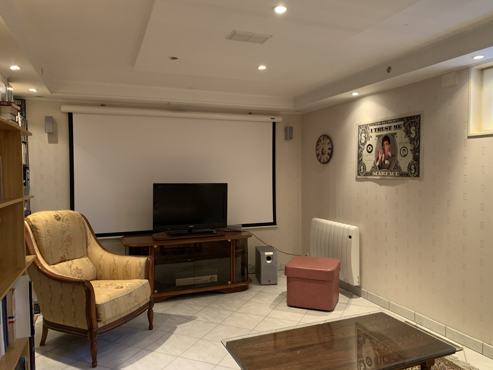 - Au sous-sol : une buanderie entièrement carrelé, une salle de cinéma, un garage double carrelé avec porte motorisée.