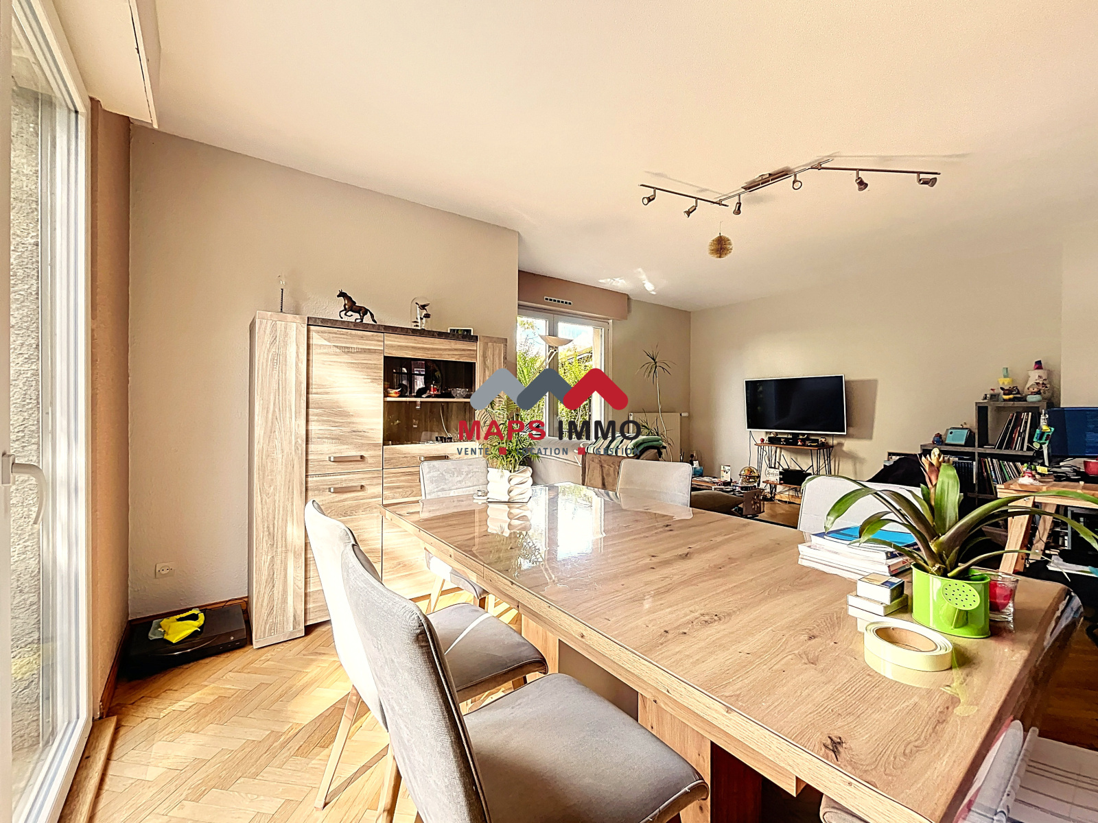 Une entrée, un dégagement avec placard, une cuisine indépendante, un WC, et surtout une belle pièce de vie spacieuse et baignée de lumière naturelle.