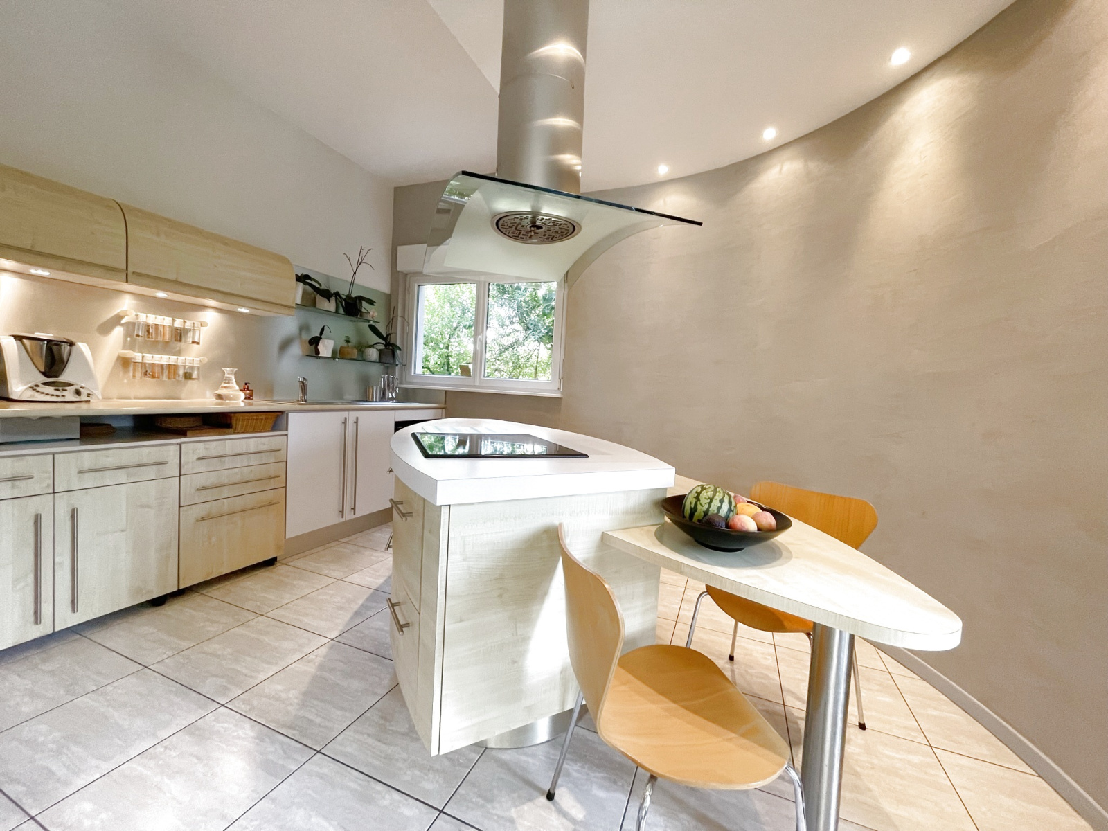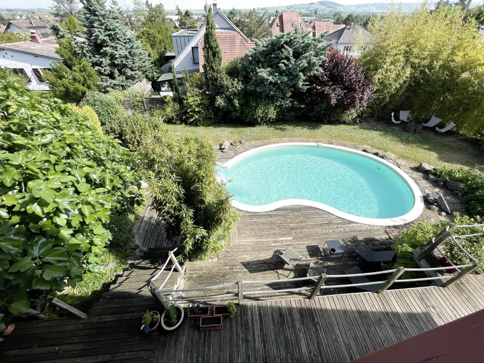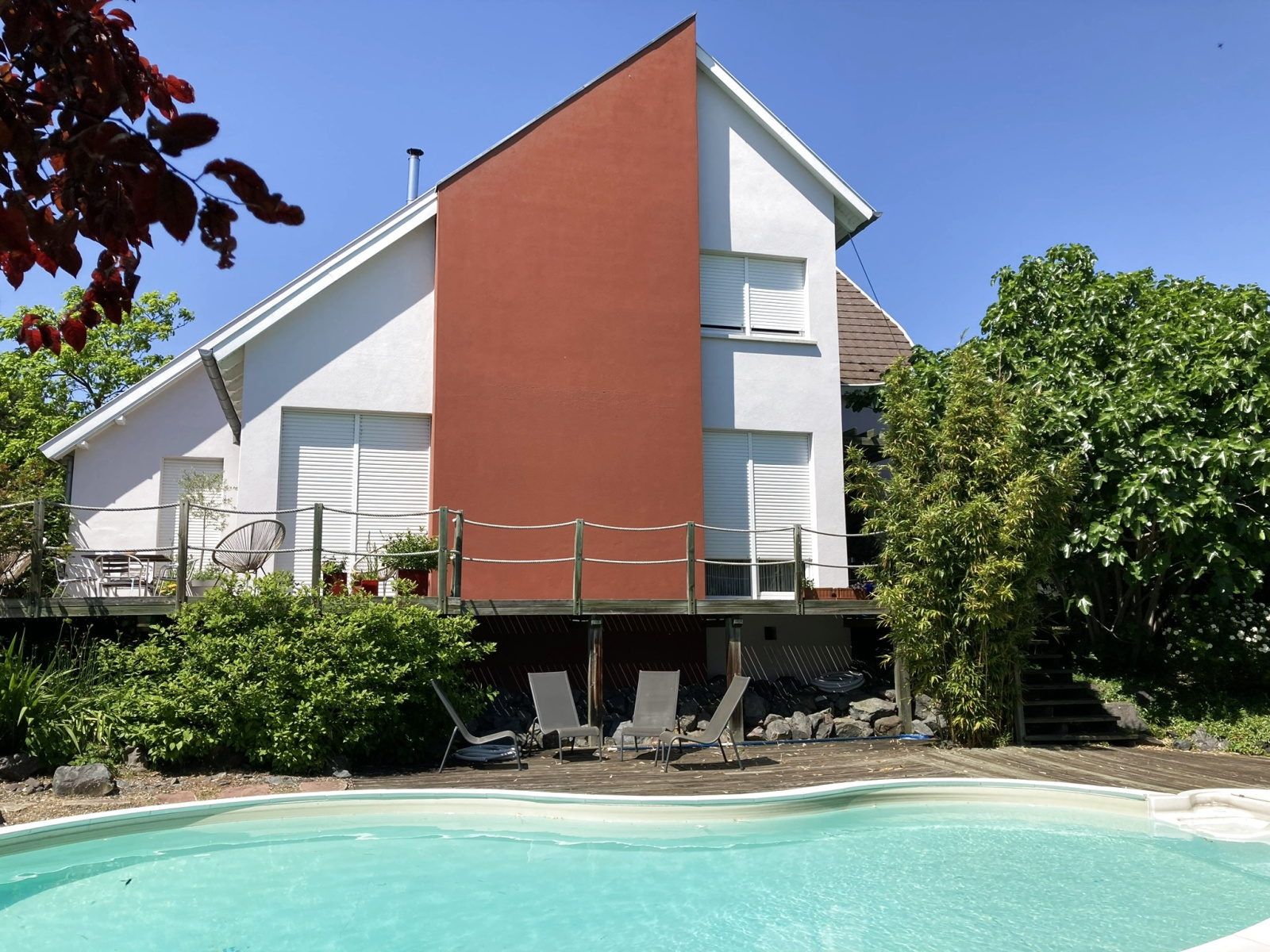 L’espace de vie bénéficie d’une triple orientation EST+SUD+OUEST et avec ses larges baies vitrées sans vis-à-vis offre une luminosité de tous les instants. Cet espace s’ouvre à la belle saison sur une vaste terrasse panoramique avec une vue directe sur le jardin et la piscine en contre bas.