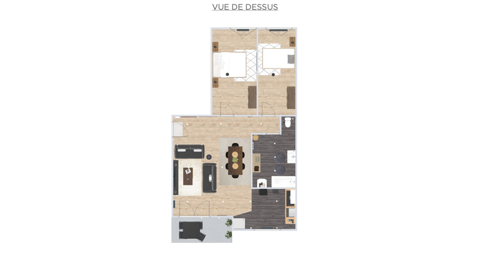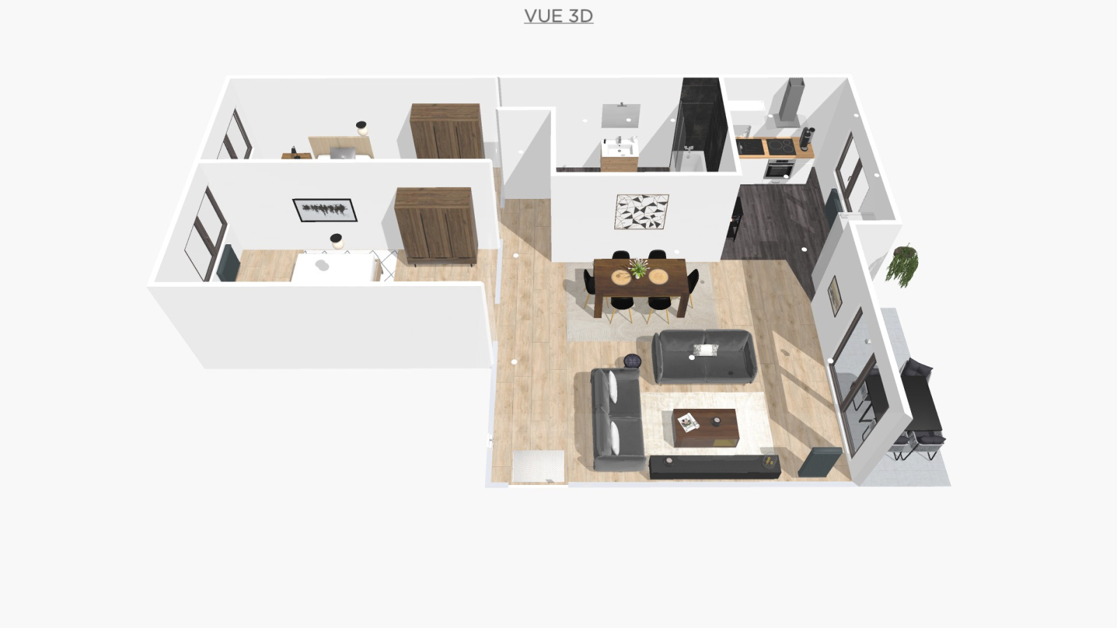 Possibilité d'aménagement d'un 3 pièces ( cf visuels) avec terrasse orientée plein sud.