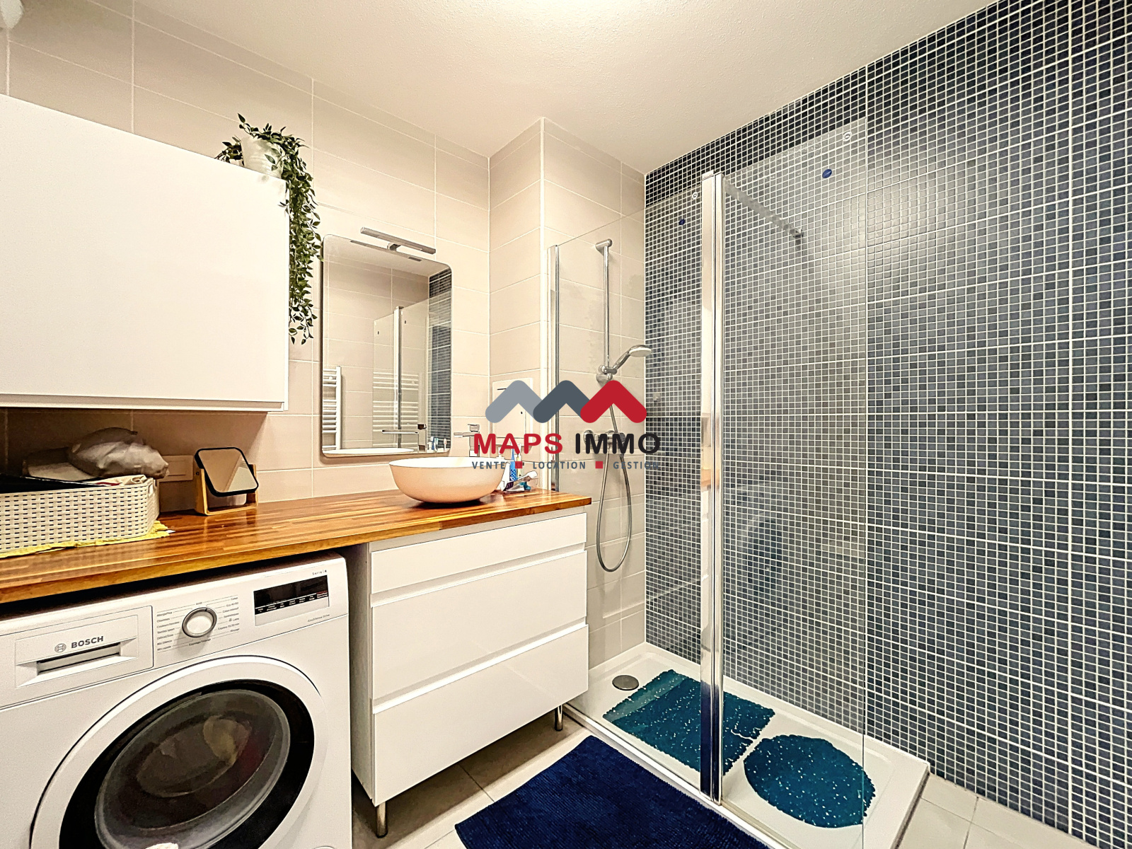 - Une salle d’eau moderne avec douche et coin buanderie