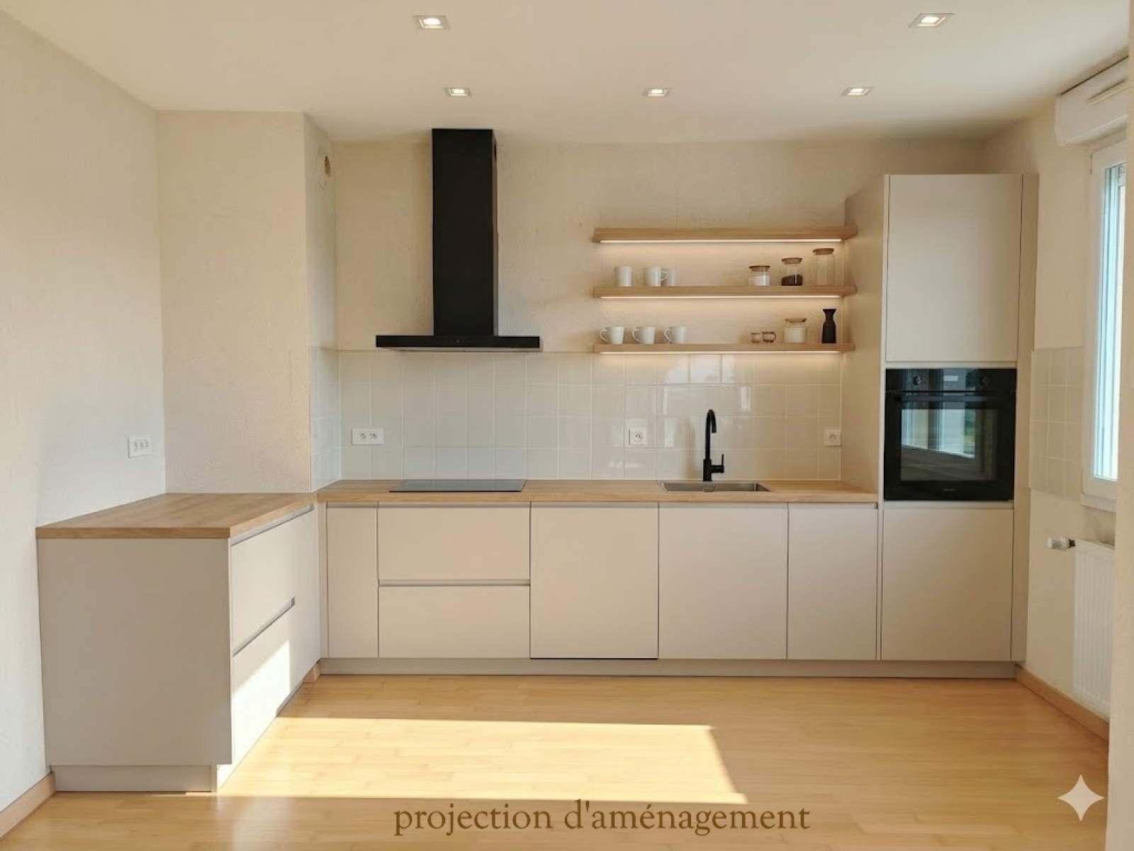 Dans le même espace, une cuisine ouverte et pré-équipée (crédence, arrivées d'eau et prises installées), à aménager selon vos besoins.