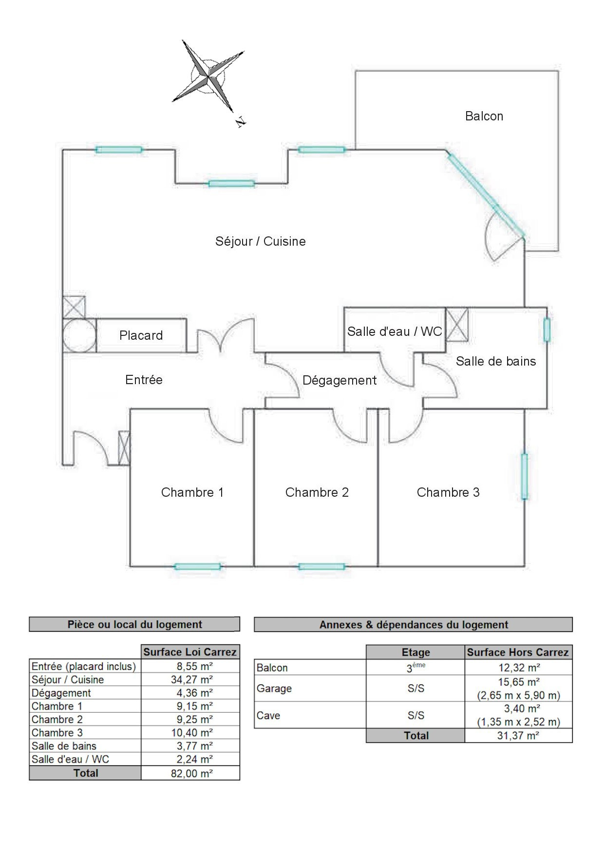 Le bien est complété d’une cave de 3 m2 et d’un garage privatif de 15 m2 (2,65 m x 5,90 m), doté d’une prise électrique et d’un point lumineux.