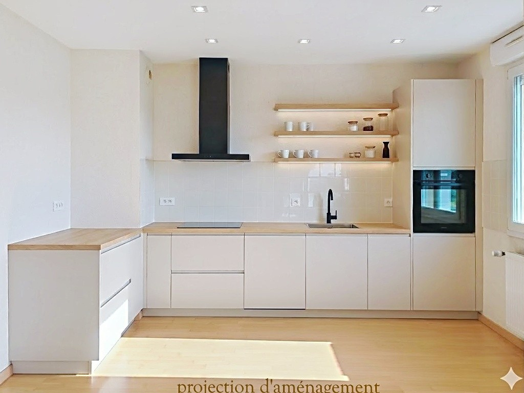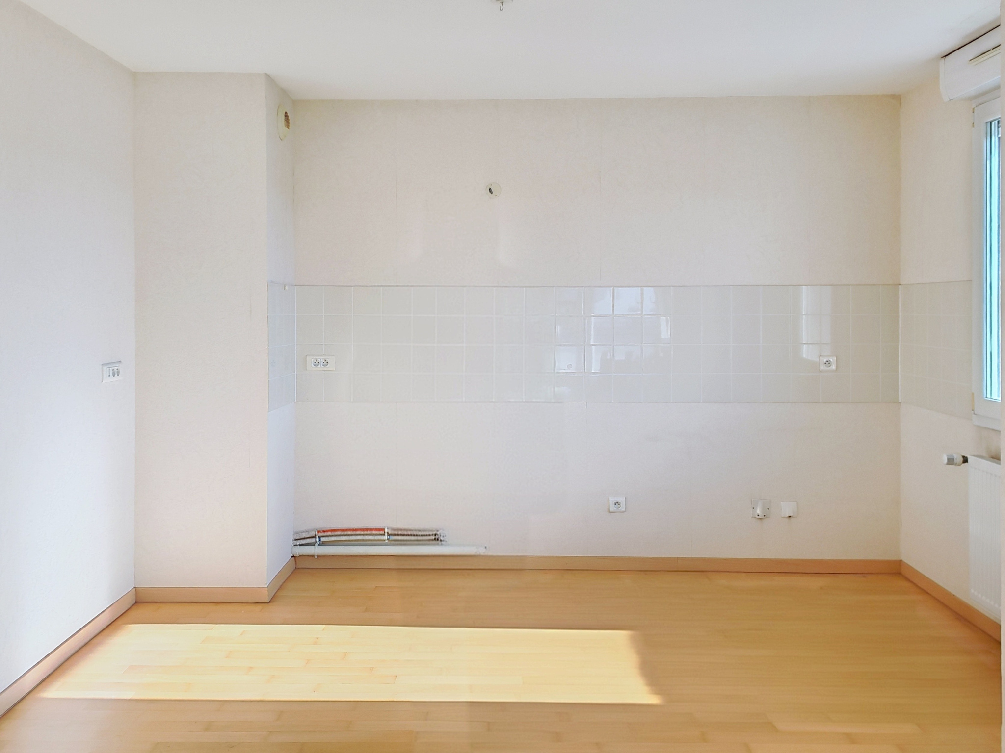 Dans le même espace, une cuisine ouverte et pré-équipée (crédence, arrivées d'eau et prises installées), à aménager selon vos besoins.