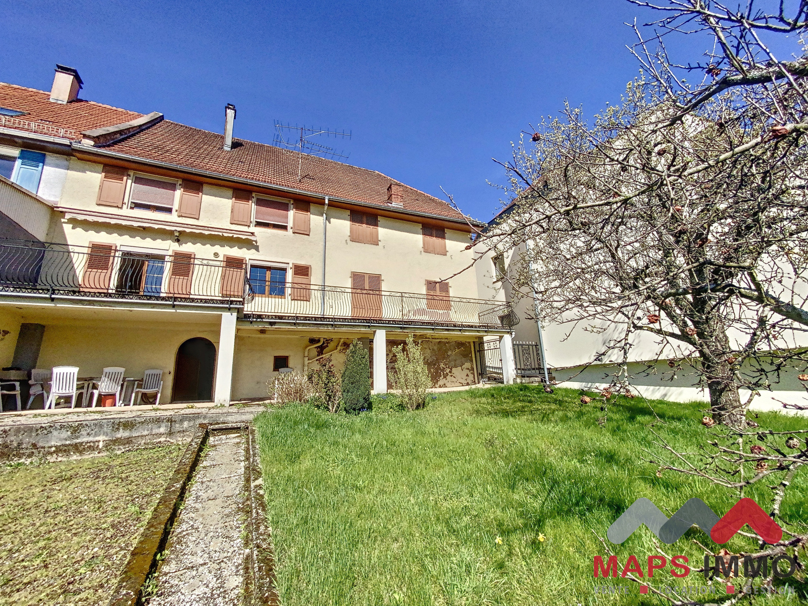 A l'étage : 3 chambres, une grande salle de bain avec baignoire, douche et WC.