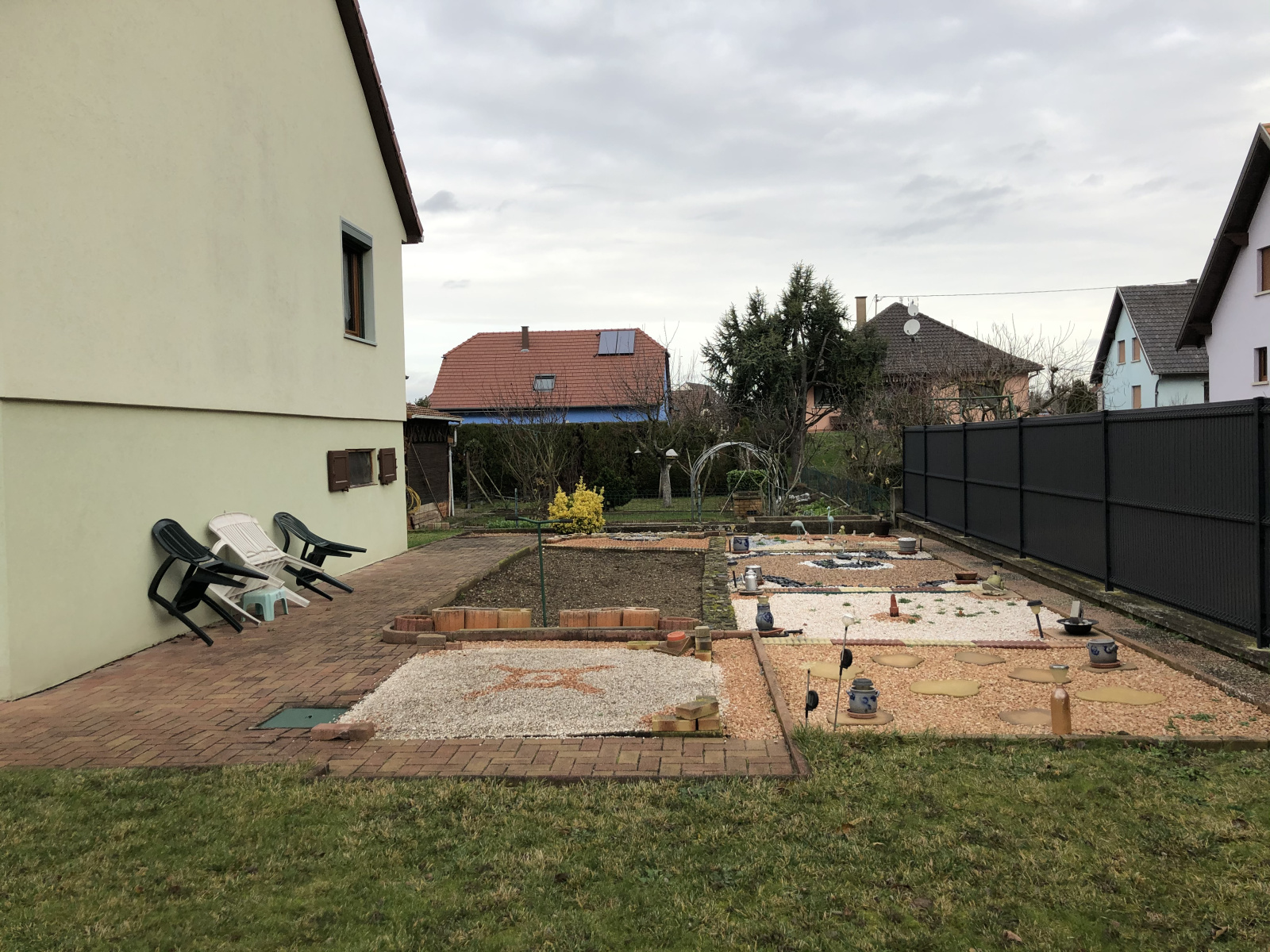 Extérieur : Une cour avec une place de parking, jardin.