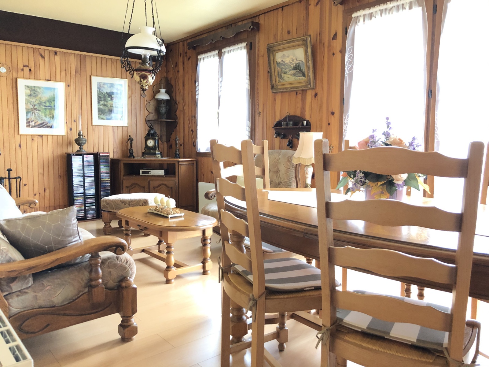 Sous-sol : Une pièce aménagée, chaufferie/buanderie (Chaudière fioul année 1990), garage double en enfilade porte manuelle, débaras.