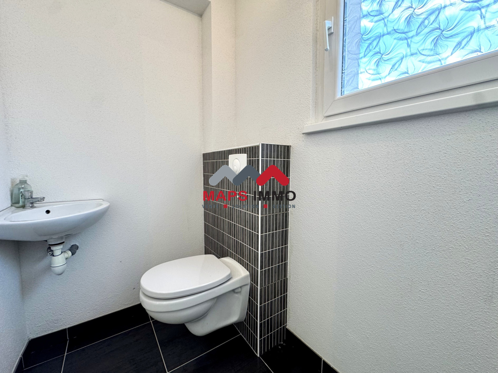 À l’étage, la maison dispose de trois chambres ainsi que d’une salle de bain avec WC.