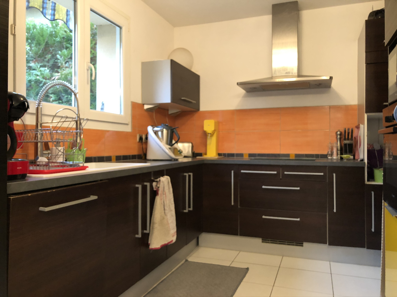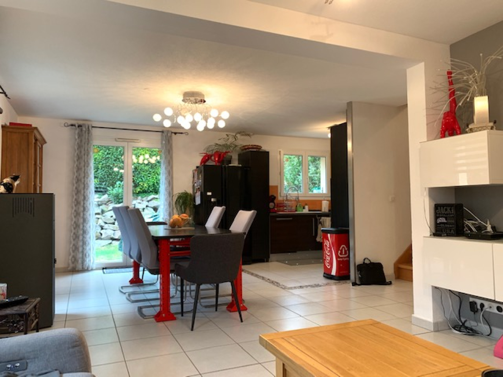 Rdc : Une entrée donnant sur le salon/séjour avec un poêle à granulés programmable ouvert sur la cuisine entièrement équipée avec accès jardin, un wc, un garage, un espace buanderie/débaras.