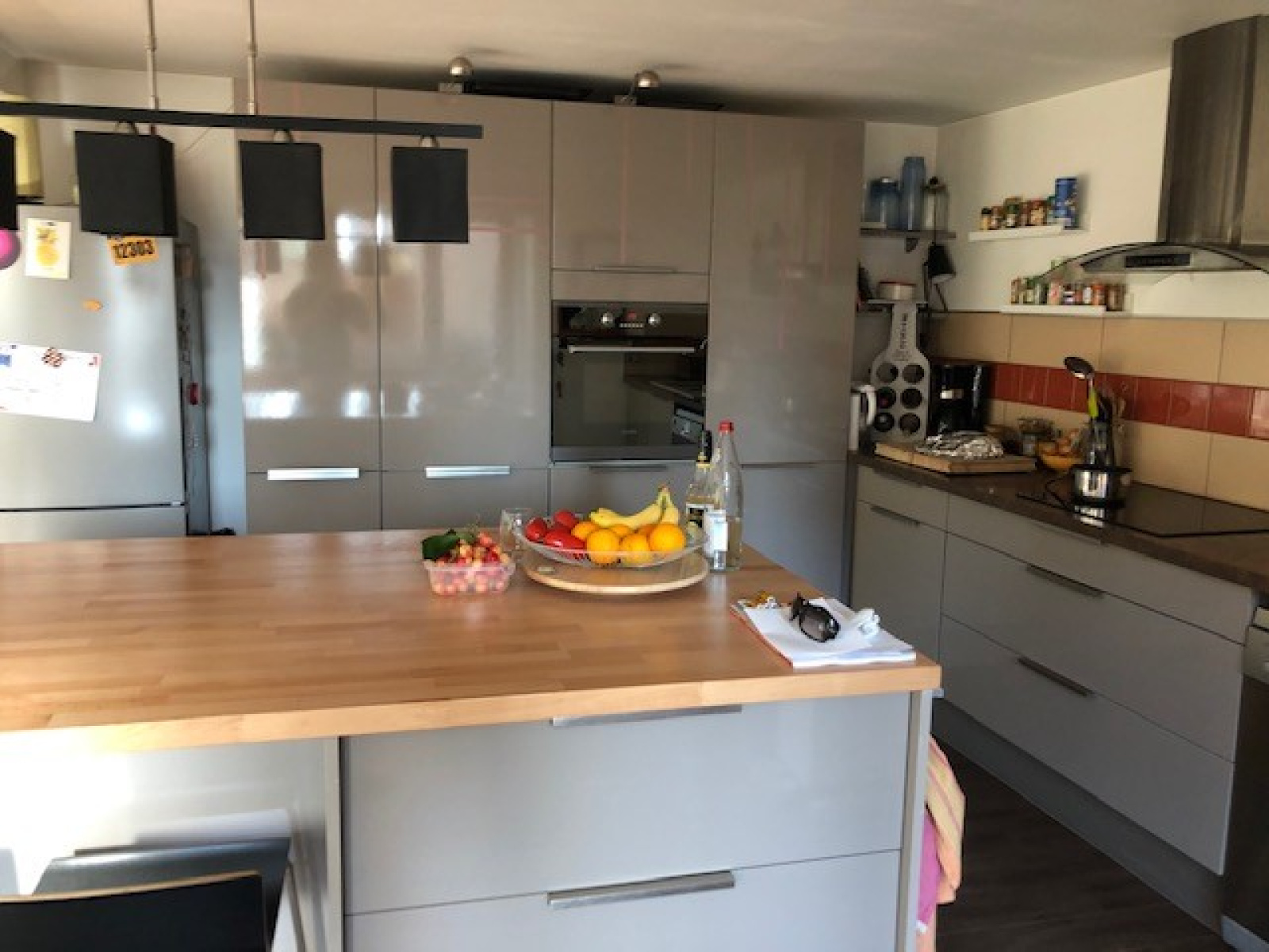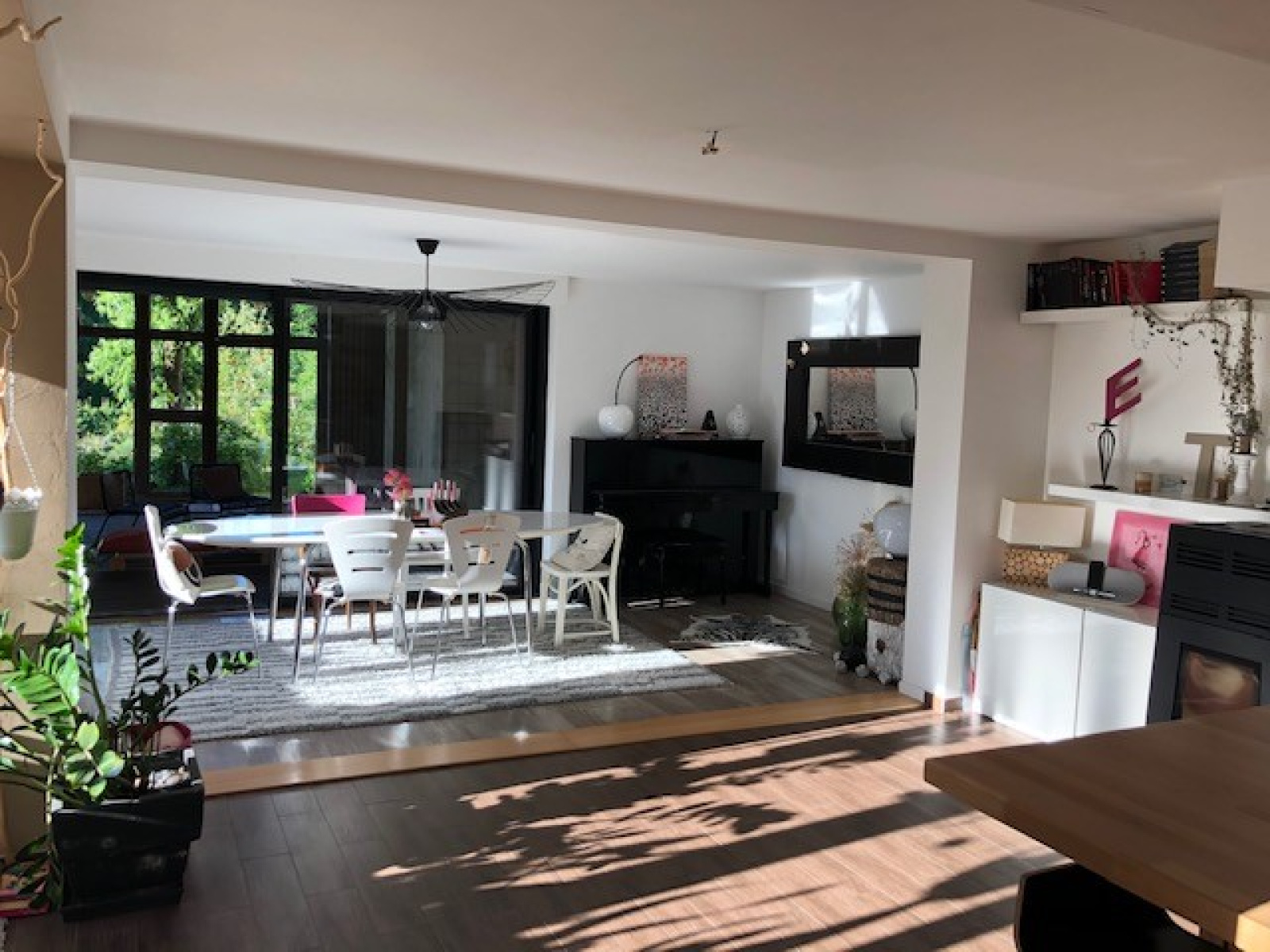 Entrée, cuisine ouverte sur une salle à manger avec son Poêle granules, donnant sur la terrasse couverte et le jardin avec espace cave et rangements.