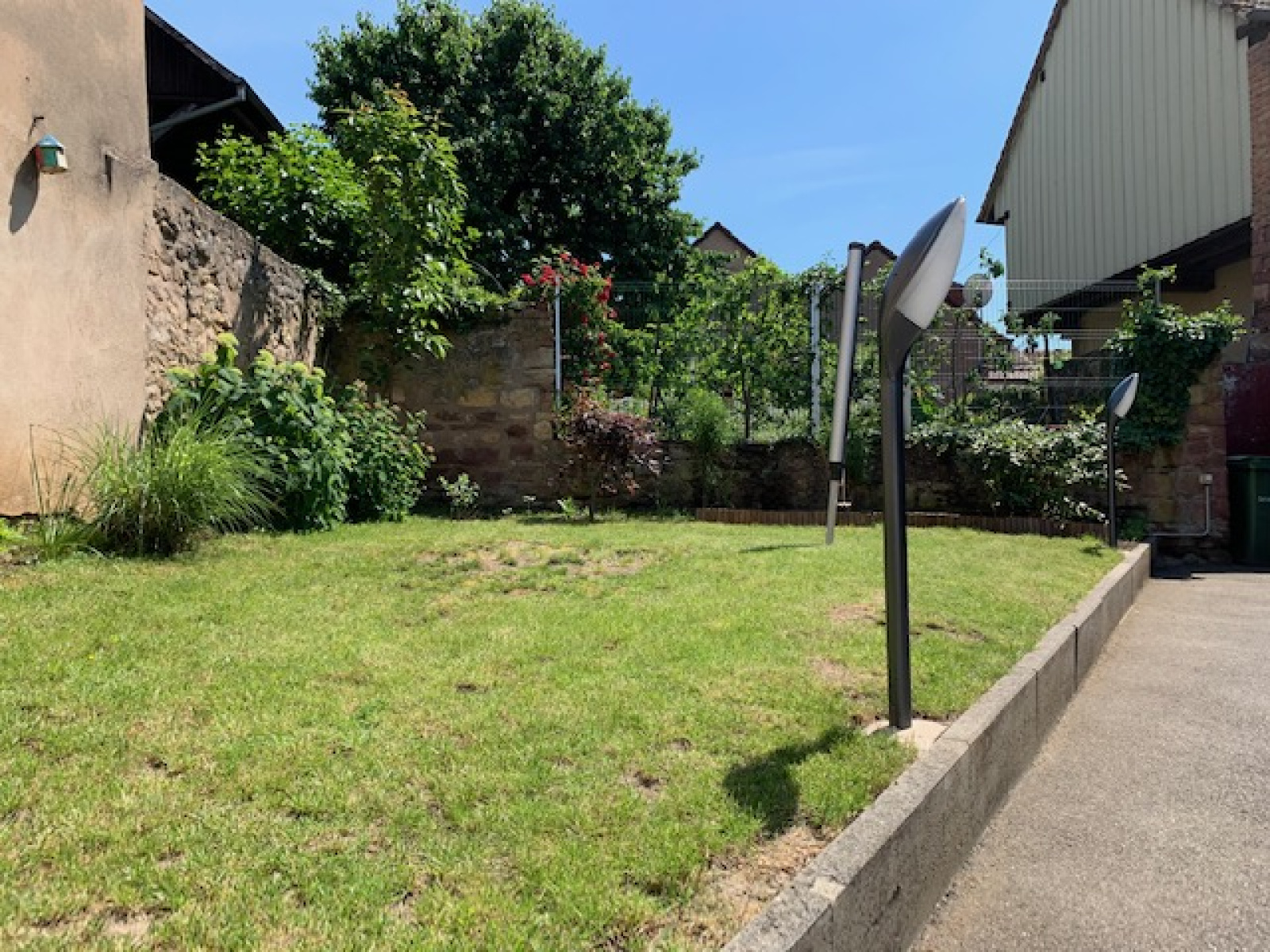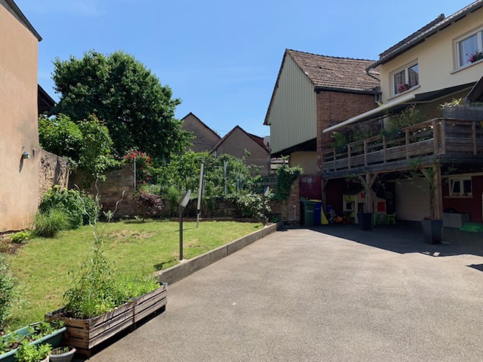 L'entrée se fait par un portail donnant sur une cour intérieure goudronnée, où se trouve également le jardin et deux places de parking couvertes.