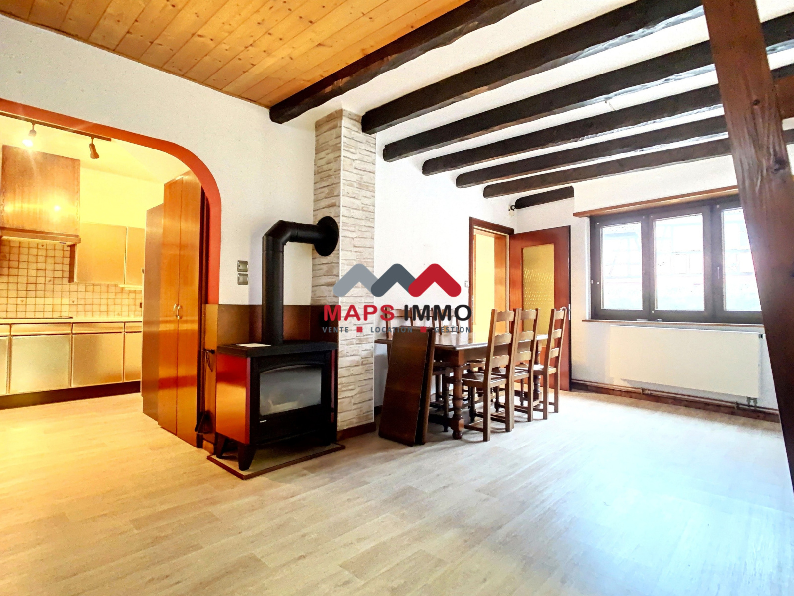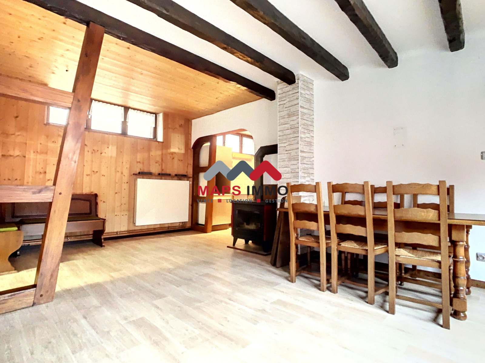 - Au rez-de-chaussée : Une entrée, un salon-séjour agrémenté d'un poêle à bois,une cuisine séparée équipée ainsi que deux garages.