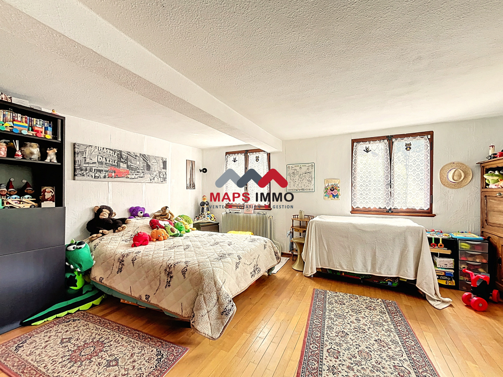 À l’étage : un palier, deux chambres, une salle à manger et un séjour en enfilade, une seconde cuisine avec accès à une deuxième salle de bain, ainsi qu’un balcon.