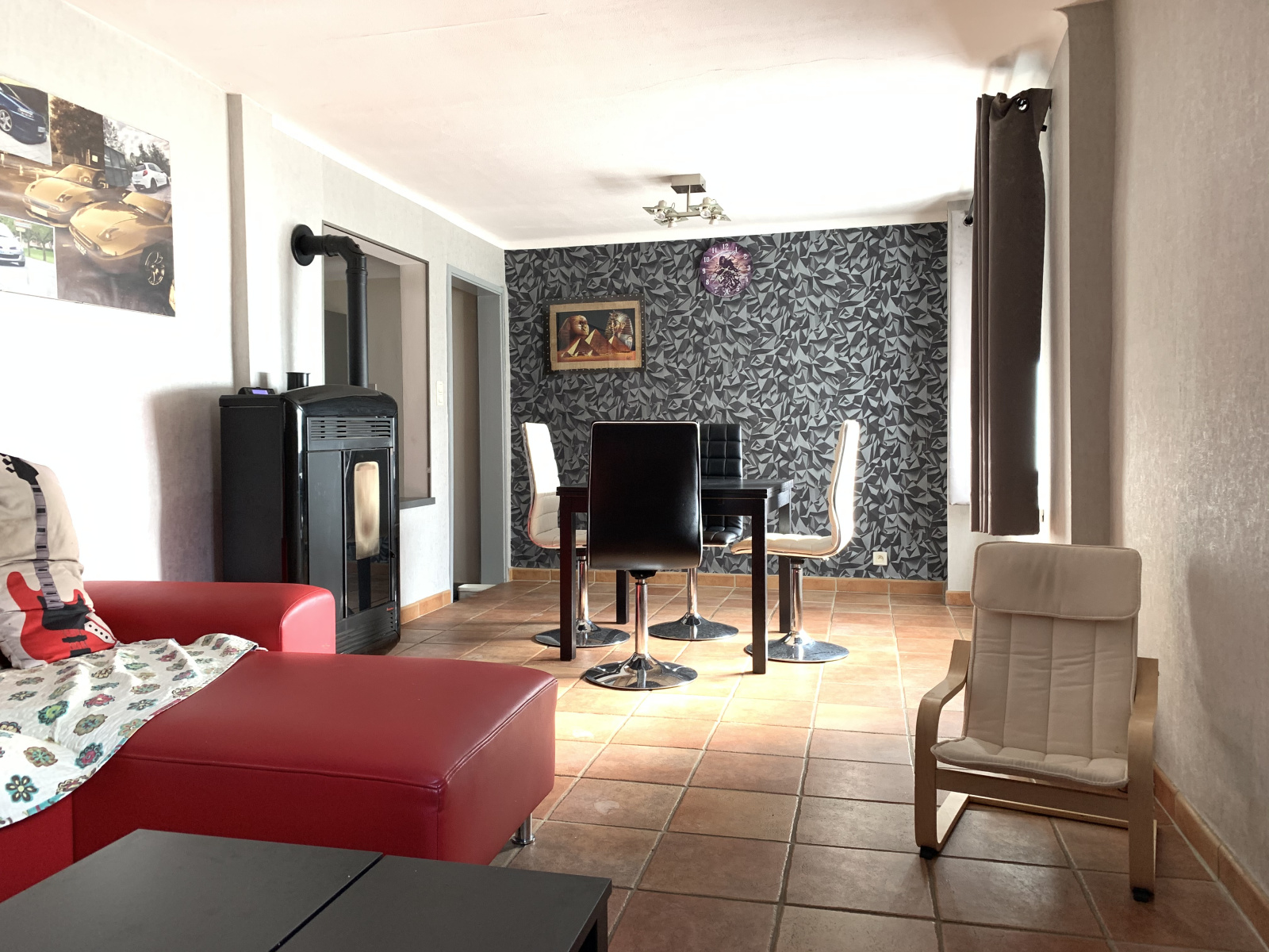 Le chauffage est électrique au sol + poêle à granules.